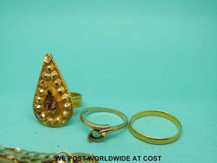 A yellow metal ring possibly Indian (5g), a 9ct gold gate bracelet, 9ct gold ring (6.2g) and a 22ct gold wedding band (2.4g)