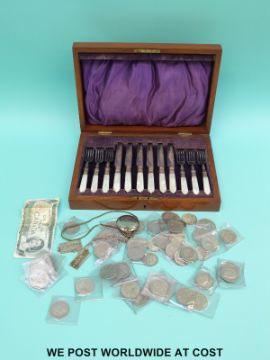 A mahogany cased mother-of-pearl handled fruit set, silver pendants with feature hallmarks, Buler pocket watch and coins including 20 pre-1947 silver half crowns (weight approximately 280g)