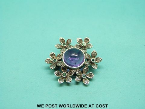 A suffragette brooch set with an amethyst cabochon surrounded by diamonds and emeralds in the form of flowers.