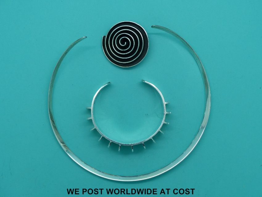 A designer hallmarked silver bracelet, necklace and concentric brooch/ pendant
