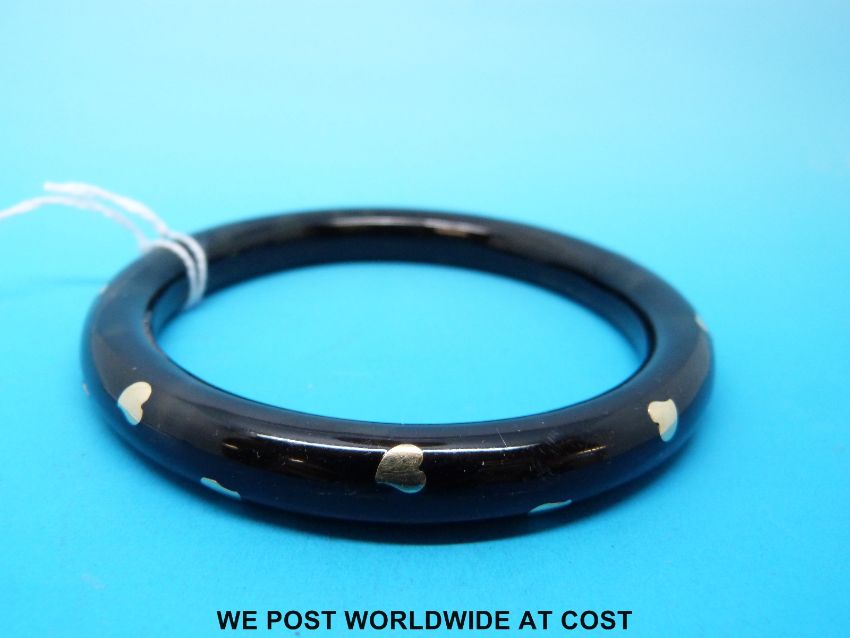 A gold inlaid or pique work tortoiseshell effect bangle, inlaid all round with hearts
