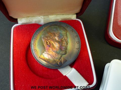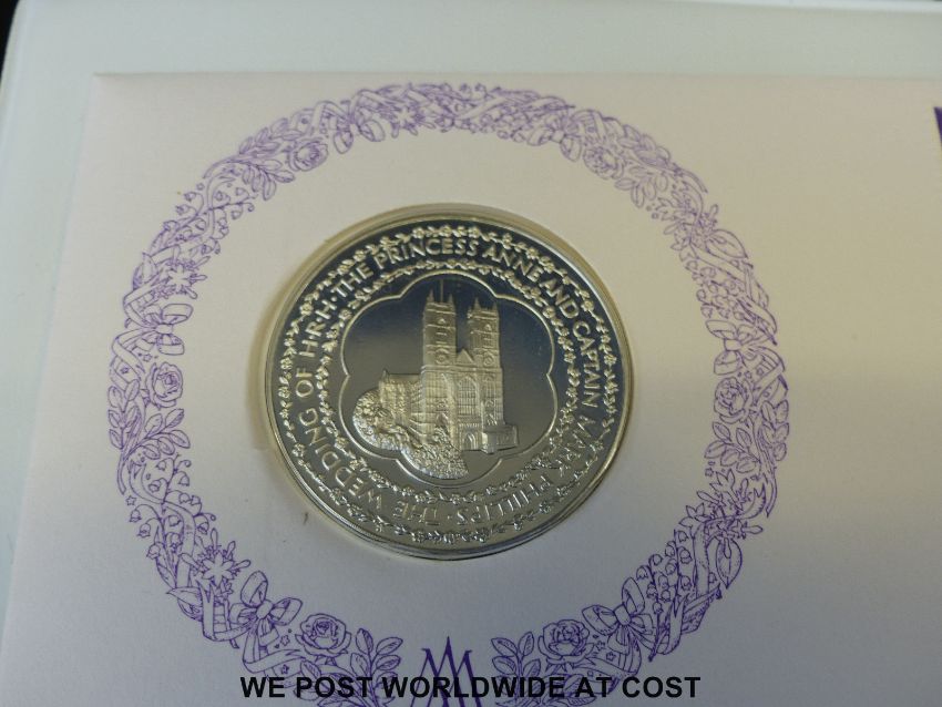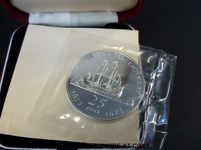 A Commonwealth of the Bahamas sterling silver coin set together with a St Helena crown, a royal wedding example and a John Kennedy cased commemorative example