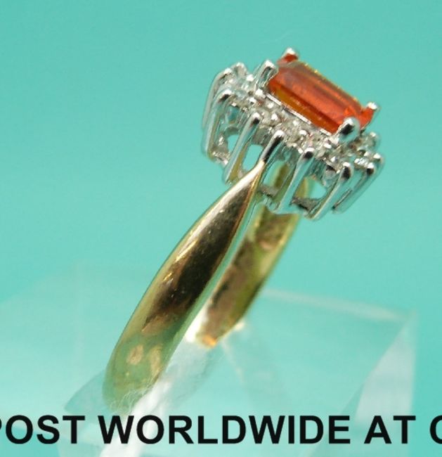 An 18ct gold ring set with a fire opal surrounded by diamonds (size L)