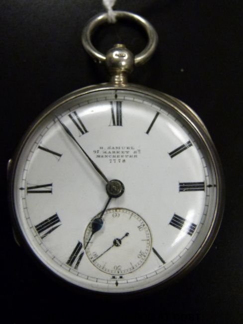 H Samuel Manchester hallmarked silver open faced pocket watch with Roman numerals, inset subsidiary seconds dial, white enamel face and named and engraved movement, case diameter 50mm, Chester 1883, movement numbered 7778