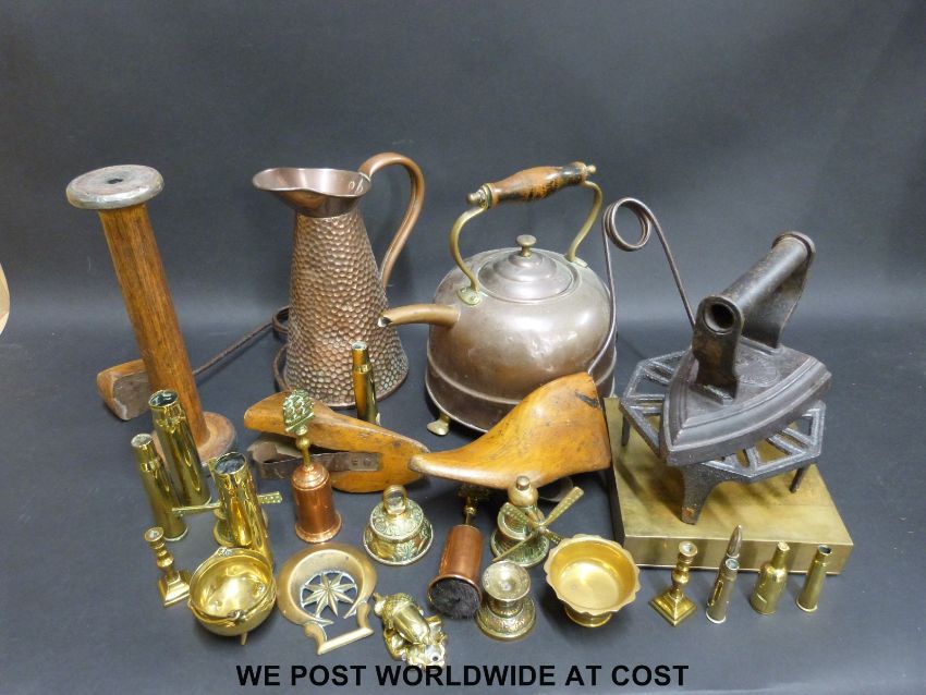 A collection of copper and brassware etc to include shoe trees, a hammered jug, 20mm WWII shell cases, a trivet etc