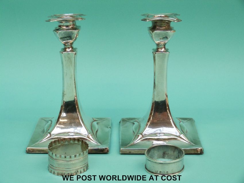 A pair of Arts & Crafts/Art Nouveau Walker and Hall Edward VII hallmarked silver candlesticks, Sheffield 1909, height 16cm together with two hallmarked silver napkin rings (42g)