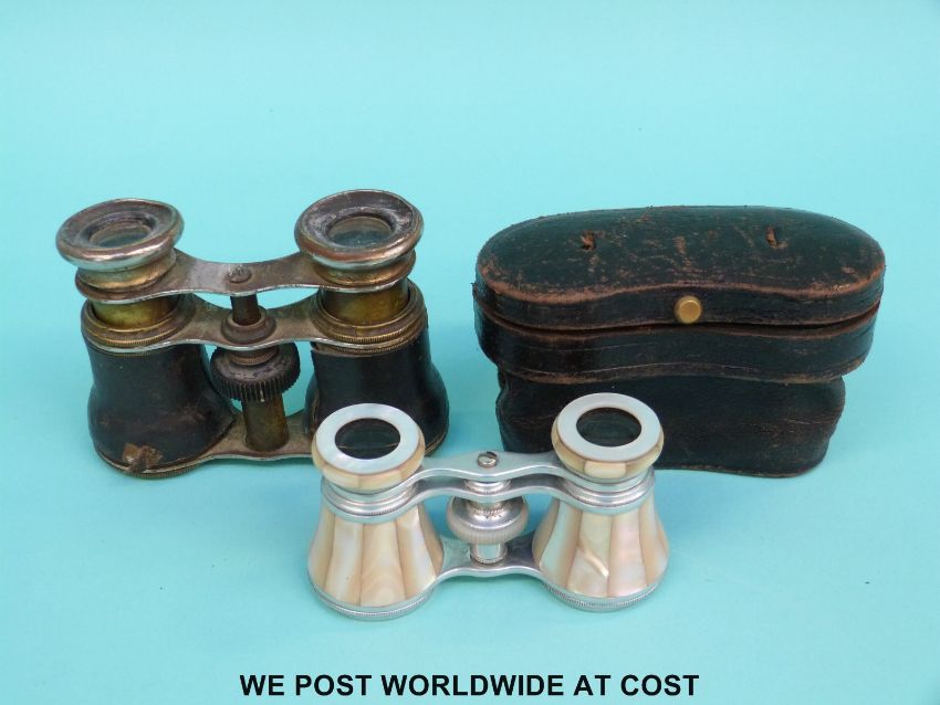 A cased pair of mother of pearl opera glasses and one other pair