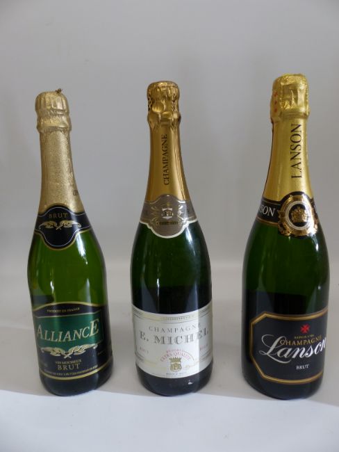 Three bottles of non-vintage champagne, E Michel, Lanson (Brut) and Alliance (vin Mousseux Brut) each 750ml, 12% , 12.5%, 10.5% volume, together with two bottles of Pays d'Oc Chardonnay (2011), 750ml, 12.5%volume; and one bottle of Napoleon brandy (VSOP), 70cl, 36% volume