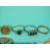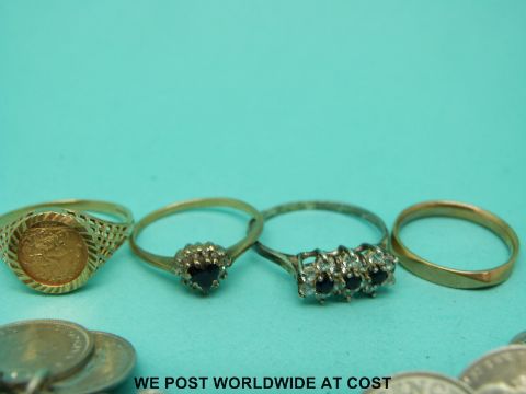 A 9ct gold ring set with a sapphire surrounded by diamonds, two other 9ct gold rings, a silver ring and a silver bracelet set with a threepence