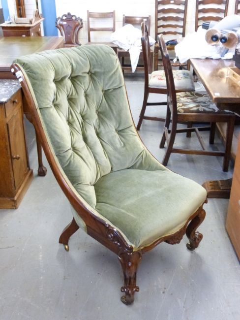 A Victorian upholstered moulded mahogany button back nursing chair raised on brass castors