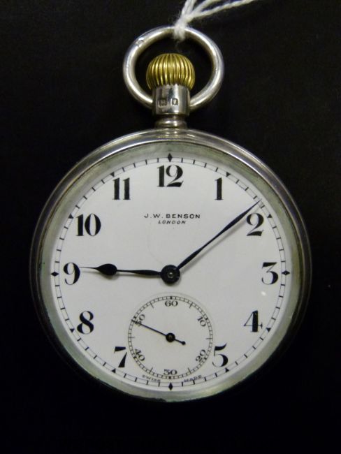 J W Benson London hallmarked silver pocket watch with Arabic numerals and blued hands to the white enamel dial, case diameter 50mm, in original box