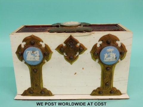 A late 19th/early 20th century country house organisational notebook set, in ivory, gilt metal and Jasperware box with spring loaded mechanism, the three leather bound books marked in gilt lettering 'personal expenses', 'house expenses' and 'memoranda' to spines (W22xD9.5xH13.5cm)