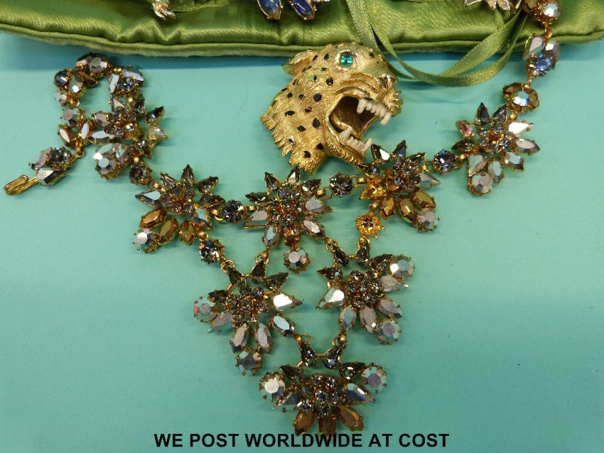A Hattie Carnegie brooch in the form of a leopard and a pair of earrings, a Coro necklace, other costume jewellery, large necklaces, Sarah Coventry ring etc