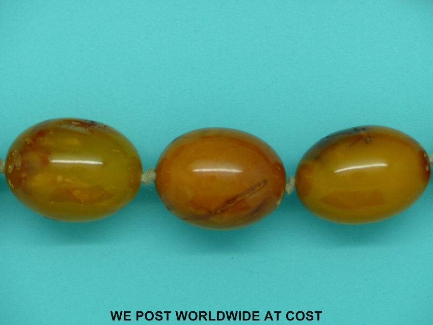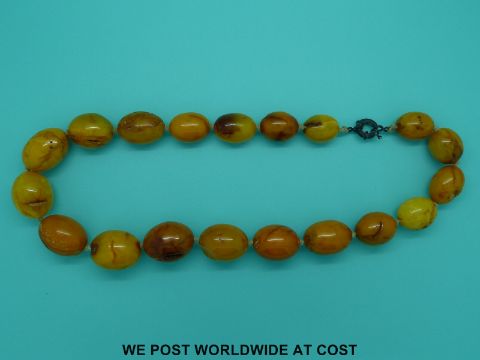 An very large amber necklace of 19 graduated beads, the largest 38x32mm, 75cm long, 257g.