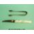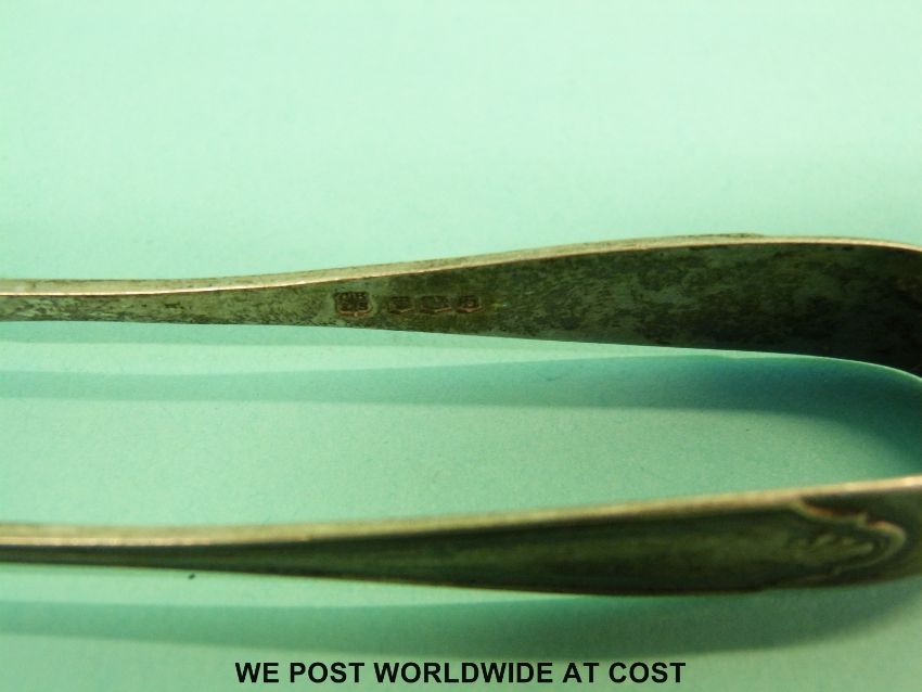 A pair of hallmarked silver tongs and a hallmarked silver mounted mother of pearl letter opener
