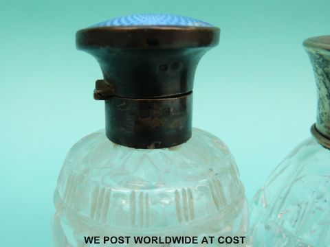 A hallmarked silver guilloche enamel topped dressing table bottle, height 11.5cm, together with a further hallmarked silver topped dressing table bottle