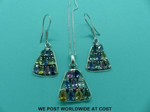 A silver pendant set with multi-coloured sapphires including pink oval cut, blue oval and pear cut etc with a matching pair of earrings