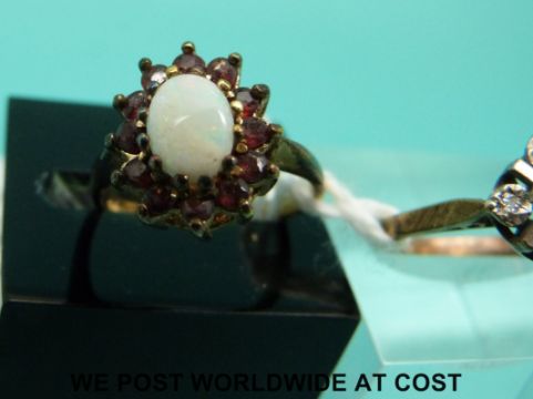 A 9ct gold ring set with diamonds (size J) and a 9ct gold ring set with an opal and garnets (size J)