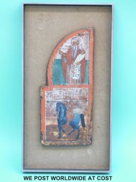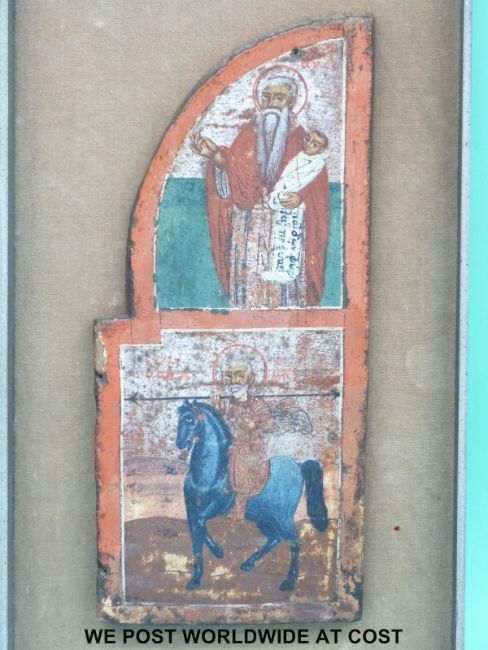 An 18th/19thC framed Russian triptych icon of Saint Stylianos of Paphlagonia with the infant child to whom he healed through the Holy Spirit and Saint Minas who proclaimed his Christian faith whilst a soldier of the Roman Empire. The vendor purchased this item from Maria Andipas Icon Gallery, Gallery Larsel Verso (H29xW13cm)