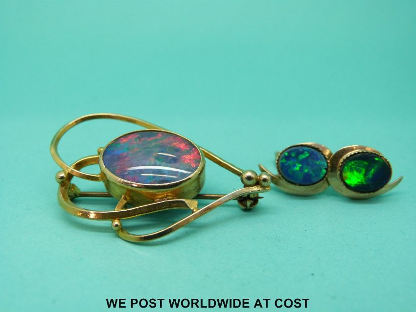 A yellow metal brooch set with an opal doublet and a pair of 9ct gold earrings set with synthetic opals