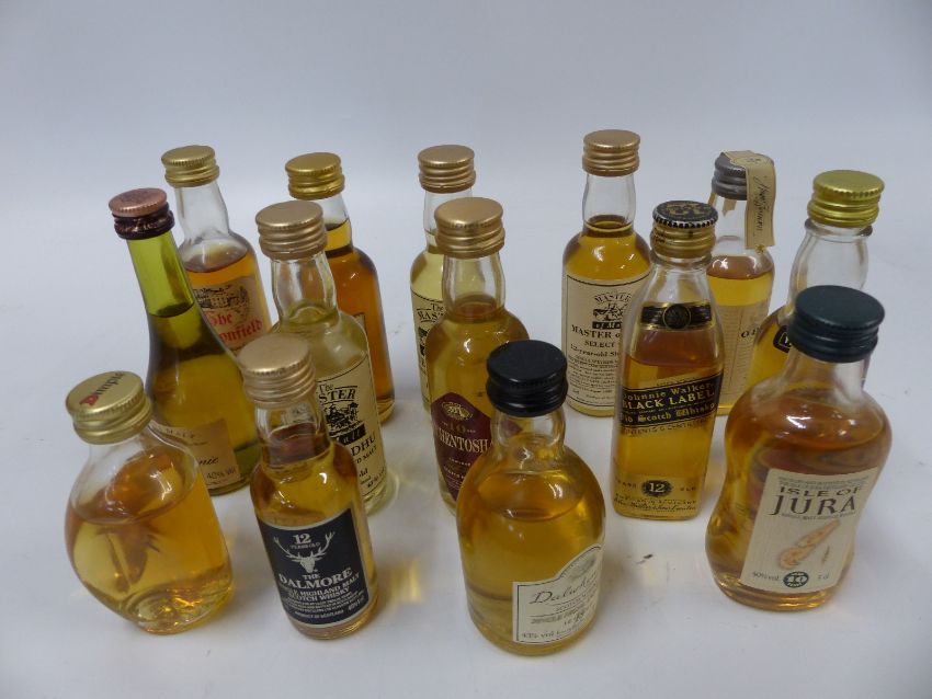 Fourteen mainly 5cl single malt whisky miniatures to include Jura 10 year, Dallas Dhu 18 year, Auchentoshan 10 year, Dalwhinnie 15 year, Dalmore 12 year, Teaninich 17 year, Balvenie 10 year, oban 14 year, Macallen 10 year,Dimple 12 year, Bowmore 16 year and Johnnie Walker Black Label 12 year. All 5cl, 40-43% vol