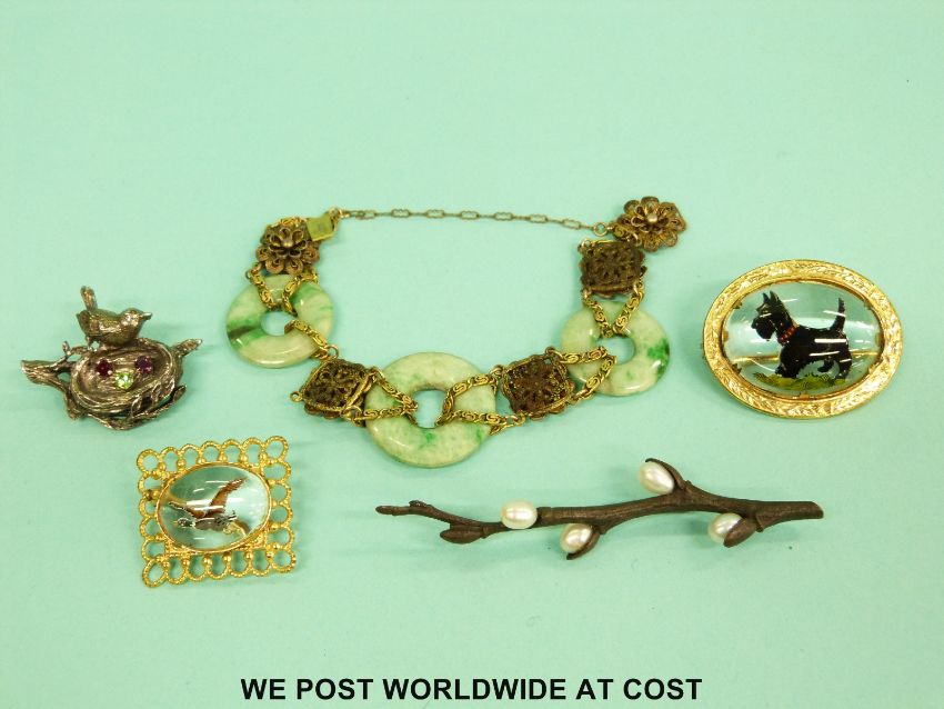 Two reverse painted brooches, one depicting a duck and the other Mizpah depicting a Scottie dog, a brooch set with pearls, and a filigree bracelet set with jadeite