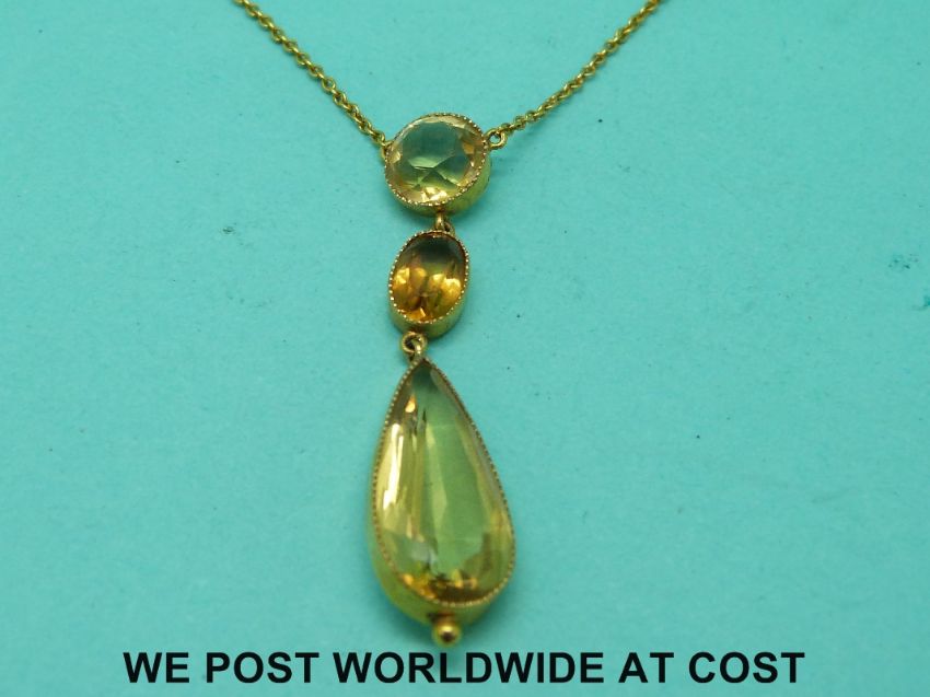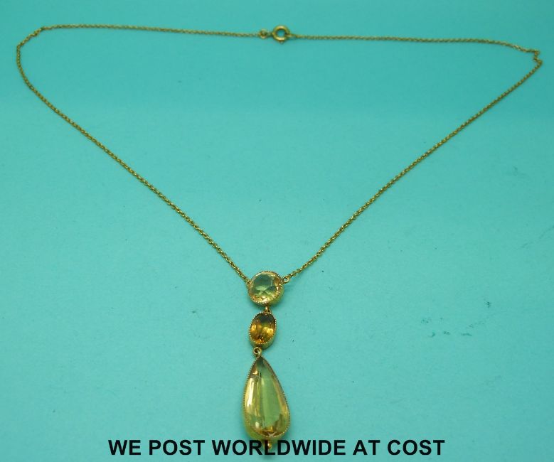A yellow metal necklace marked 9ct gold set with pear cut, oval cut and round cut citrines