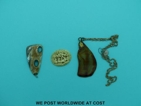 A small carved ivory oval panel, a jadeite beaded necklace, a jadeite brooch, a coral necklace and an abalone pendant