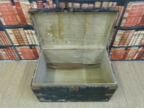 A metal bound steamer trunk and four vintage pieces of luggage (trunk H48xL84XW51)
