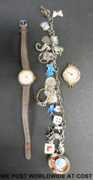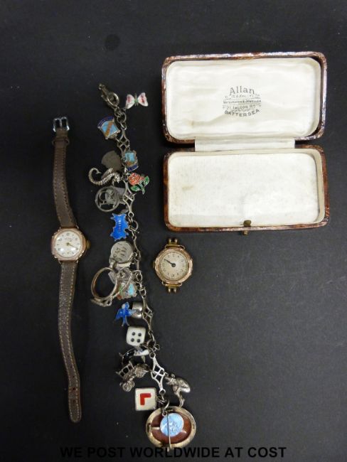 Two 9ct gold ladies wristwatches together with a charm bracelet and vintage jewellery boxes.