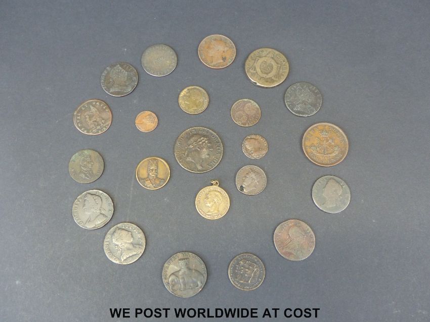 A small collection of George Il copper etc, bank tokens, Romulus et Remus Nurenberg jeton, Bank of Upper Canada one penny token etc