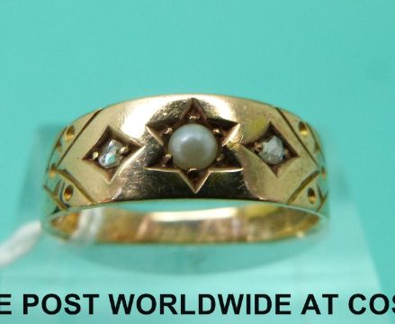 A Victorian hallmarked 15ct gold ring set with a seed pearl and two diamonds (size M/N)