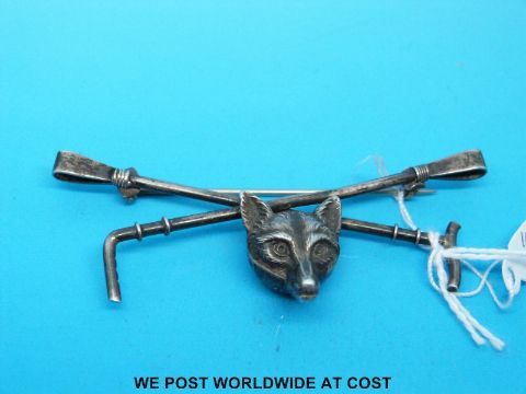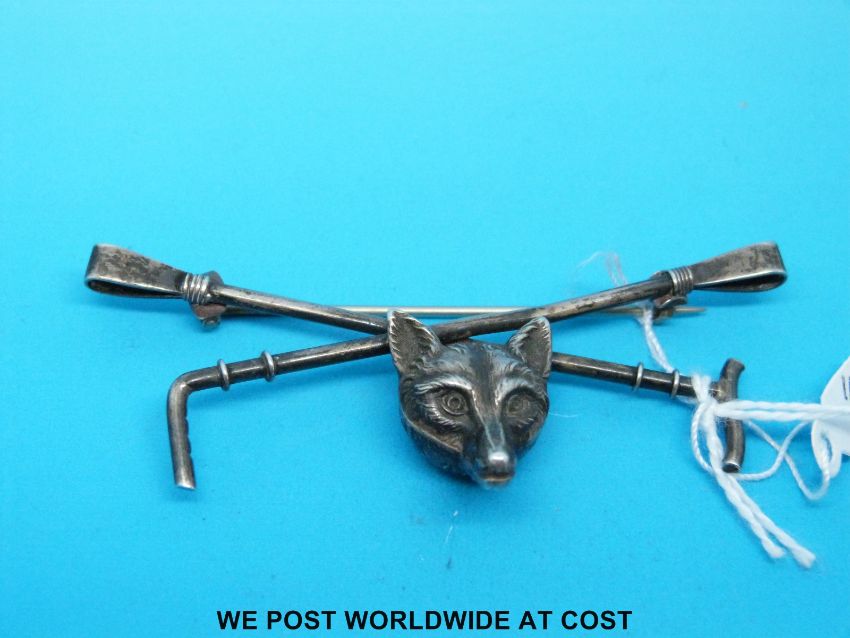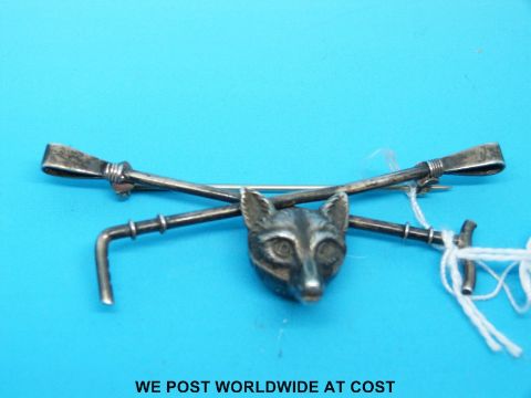 A white metal brooch in the form of a fox and riding crop