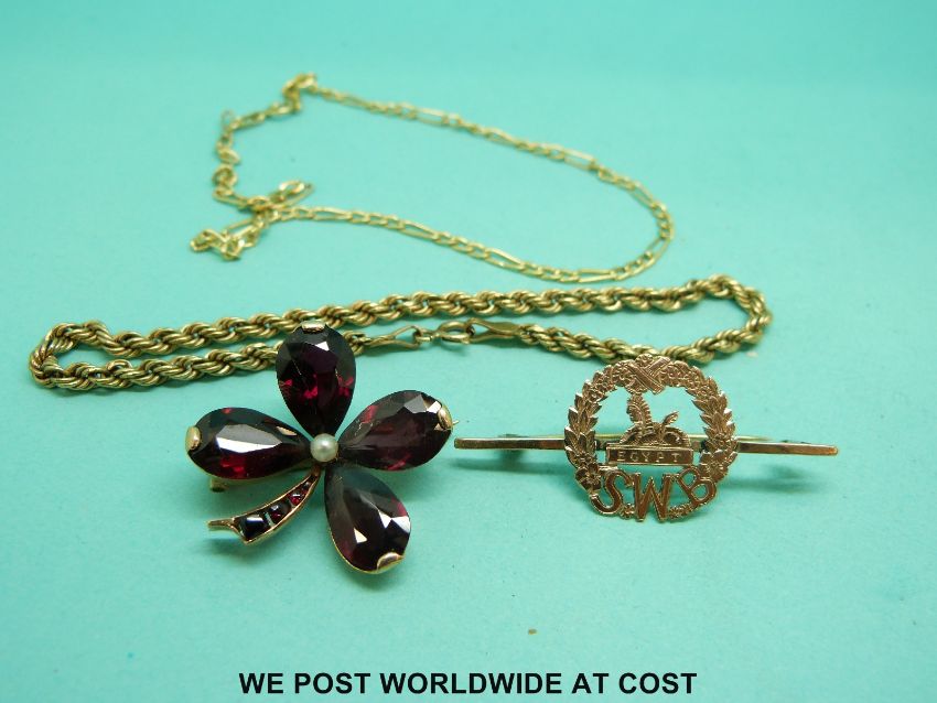 Two 9ct gold bracelets, a 9ct gold South Wales Borderers Egypt regimental brooch and a yellow metal brooch in the form of a flower set with garnets and a seed pearl