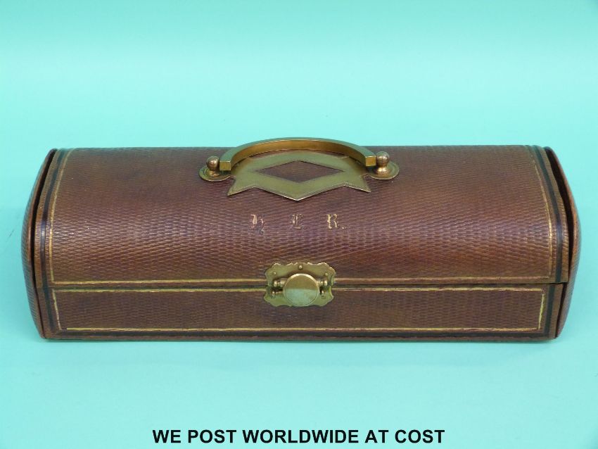 A tooled leather and gilt metal mounted glove box opening to reveal a padded silk interior, the catch marked Depose