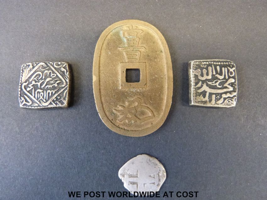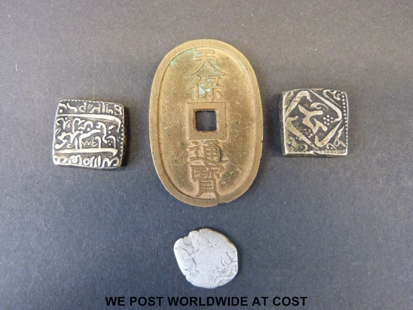 Two Middle Eastern silver square coins, together with a hammered example and a bronze Chinese cash coin, silver 30g