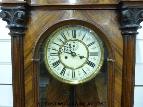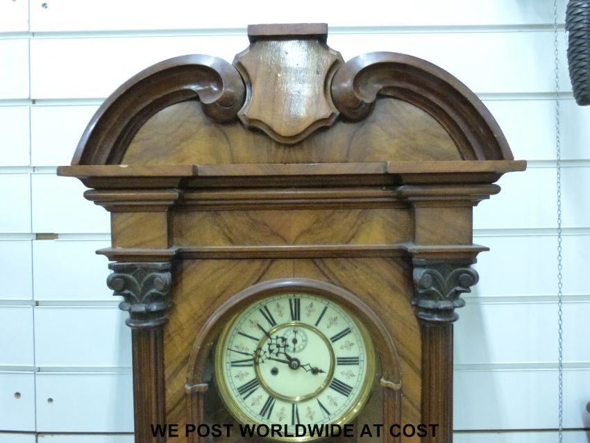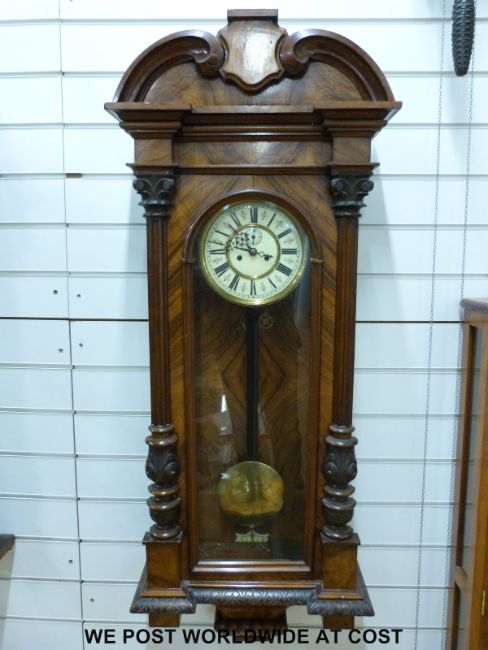 A mid to late 19thC regulator wall clock, the ivory coloured dial with Roman numerals, gilt bezels and secondary seconds dial, the two train movement striking on a gong, with ebonized pendulum and large brass bob. The case with half reeded colums and acanthus leaf styling