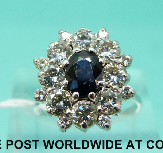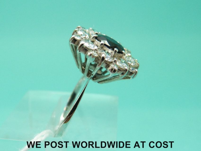 An 18ct white gold ring set with a sapphire surrounded by diamonds, with insurance valuation from SafeGuard for £2600 (size N)