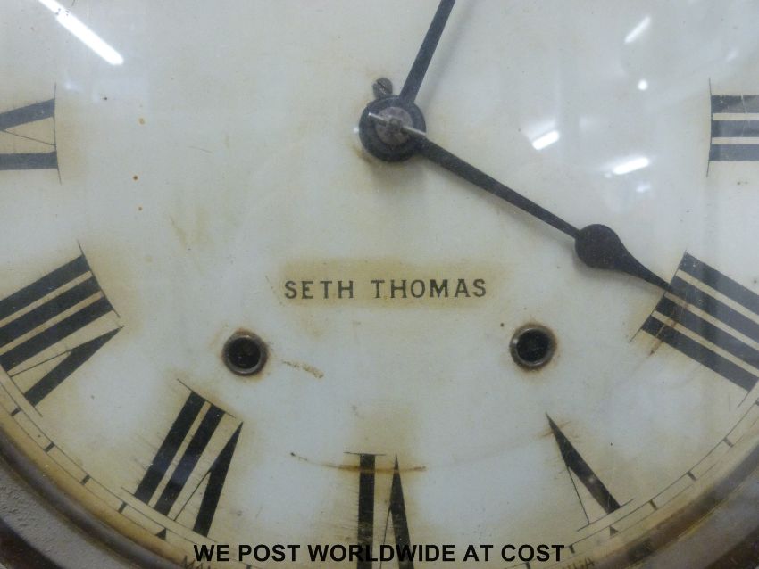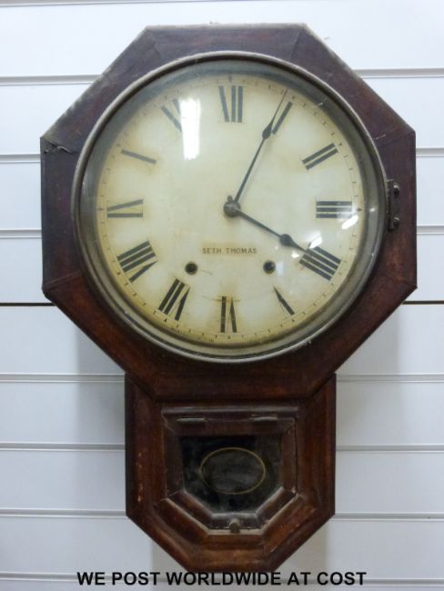 An American drop dial mid to late 19thC wall clock, the white painted dial in octagonal shaped surround bearing the name Seth Thomas, the two train movement striking on a gong