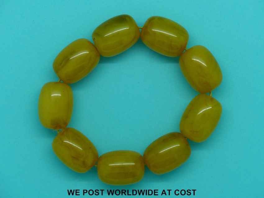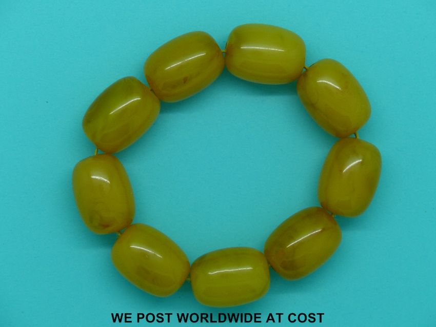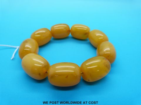 An amber bracelet of nine barrel shaped beads, all approx 2.6 x 2cm (56.4g)