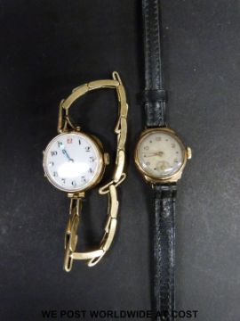 Swiss 9ct gold ladies wristwatch with blued hands, Arabic numerals and gilt highlighting on white enamel face, on expanding metal bracelet (case diameter 25mm) together with a 9ct gold ladies wristwatch with subsidiary seconds dial and Arabic numerals, on black leather strap (case diameter 20mm)