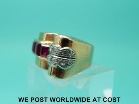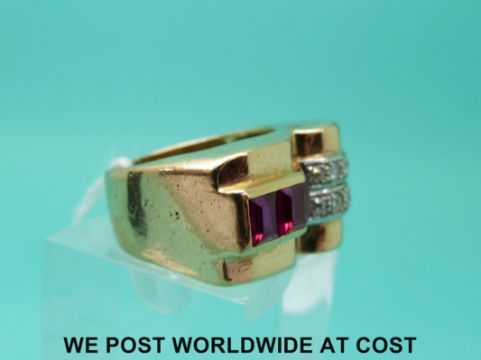 A large yellow metal ring set with three step cut synthetic rubies and ten old cut diamonds in a white metal setting, with French owl hallmark to the band (size P)