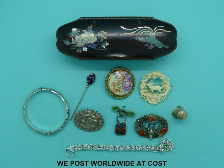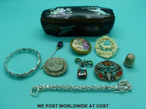 A silver bangle, silver bracelet, Miracle brooch, Victorian silver brooch, silver brooch with green enamel and an agate silver padlock clasp in a lacquer box inlaid with abalone