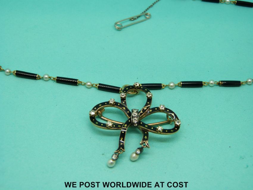 A Victorian gold brooch/pendant in the form of a bow set with black enamel, seed pearls and diamonds, with matching necklace