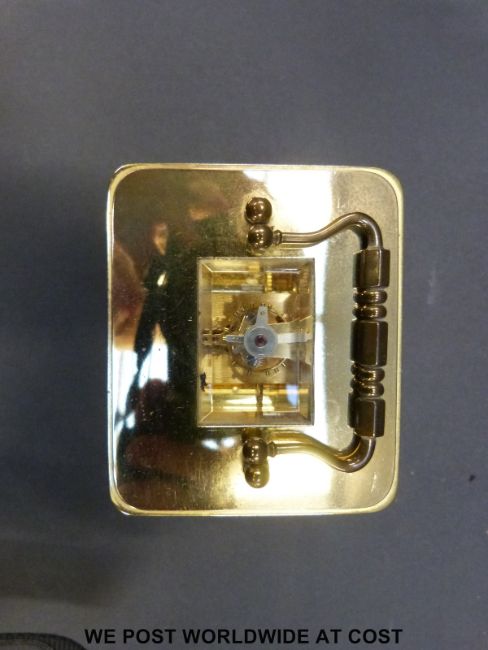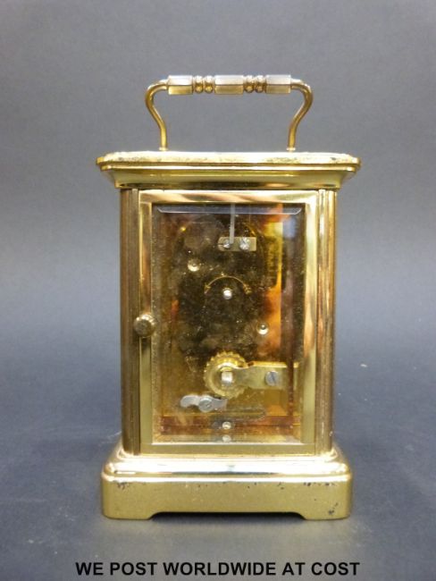 Matthew Norman to dial brass carriage clock in corniche style case, white enamel dial with Roman numerals, Breguet style hands, five bevelled glass panels (11cm tall)