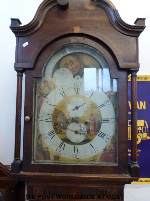 A c1790 mahogany and veneered longcase clock by Edward Shepley (1758-1807) Manchester, with fine cut mouldings and inlays, the hood with swan neck pediment on the break arch dial. The 8-day movement with finely painted enamel arched moon phase dial and subsidiary seconds and date dials, the corner paintings depict costumed ladies depicting seasons of the year, the centre picture depicting a shepherd and shepherdess, Roman numerals with Arabic to the outer, signed at bottom of chapter ring
