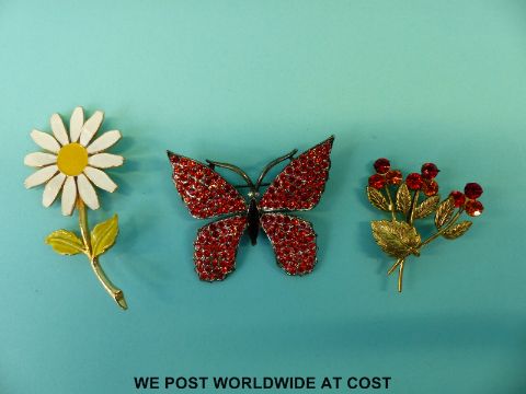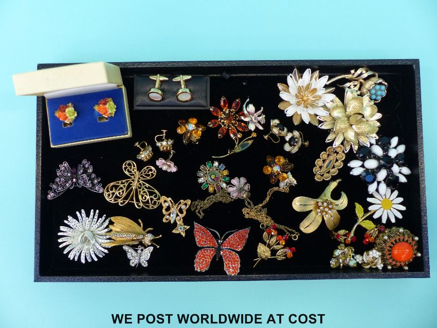 A quantity of brooches to include a Weiss crystal brooch in the form of a butterfly, Coro brooch in the form of a flower, a Napier brooch in the form of a butterfly, Sarah Coventry brooch in the form of a large flower, reverse painted necklace, Hattie Carnagie brooch in the form of a moth with moving wings etc