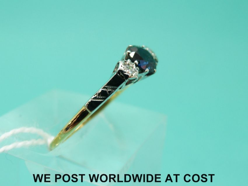 An 18ct gold ring set with a sapphire flanked by diamonds in a platinum setting (size N)