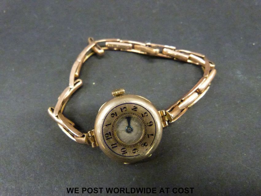 Regina 9ct gold ladies half hunter wristwatch with blue hands and Arabic numerals to the face and black enamel numerals to the case on a 9ct gold expanding bracelet