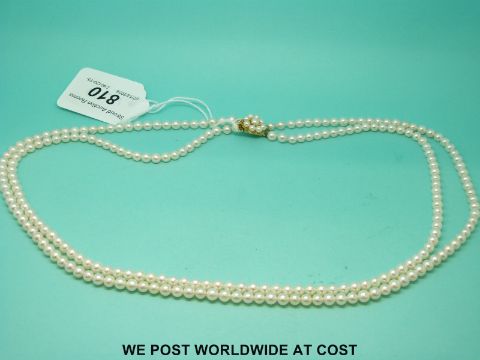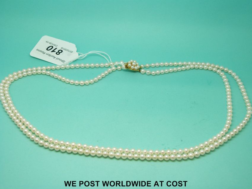 A two strand pearl necklace with 9ct gold clasp